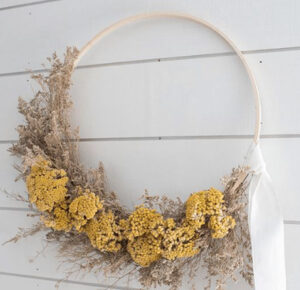 یک حلقه ساده با سیم یا حصیر آماده کنید و گل‌های خشک مورد علاقه‌تان را به آن بچسبانید. حلقه گل خشک روی در ورودی خانه، خوش‌آمدی گرم و دلنشین به مهمانان می‌دهد.