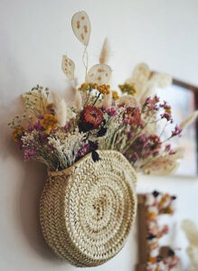 یک سبد حصیری ساده بردارید و چند شاخه گل های مختلف خشک مثل لوناریا، اسطوخودوس، دم‌خرگوشی یا خشخاش خشک‌شده را به آن ببندید. این تابلوی طبیعی، حس روستایی و آرامش‌بخشی به اتاق می‌دهد.